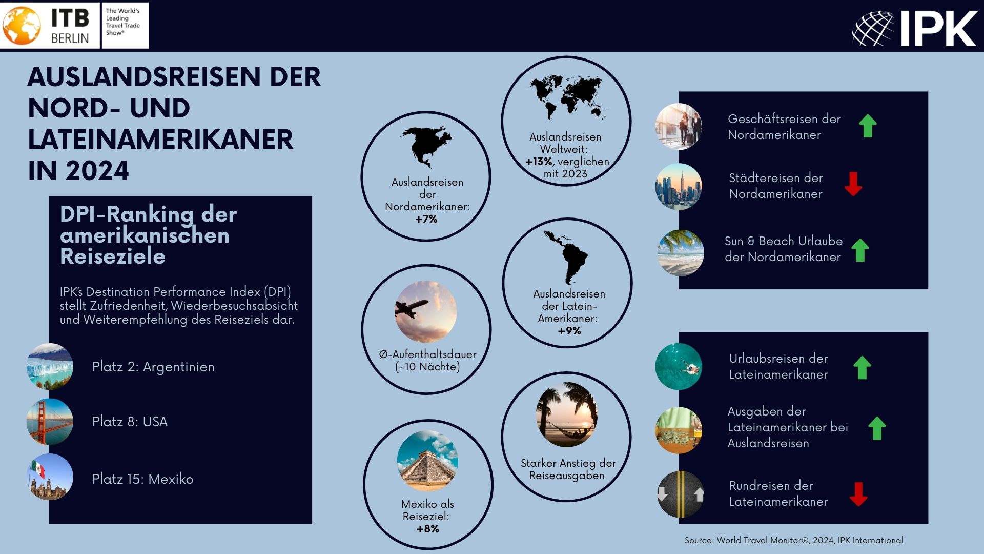 Die aktuellen Daten des World Travel Monitor® von IPK International zeigen, dass Nord- und Lateinamerika eine bedeutende Rolle im internationalen Reiseverkehr spielen. Die steigende Nachfrage nach Reisen in diese Regionen spiegelt sich sowohl in der Anzahl der Auslandsreisen als auch in der wachsenden Beliebtheit der Destinationen in Nord- und vor allem Lateinamerika wider. Die ermittelten Reiseabsichten für 2025 bestätigen dies und lassen eine dynamische Entwicklung für Reisen in 2025 erwarten.