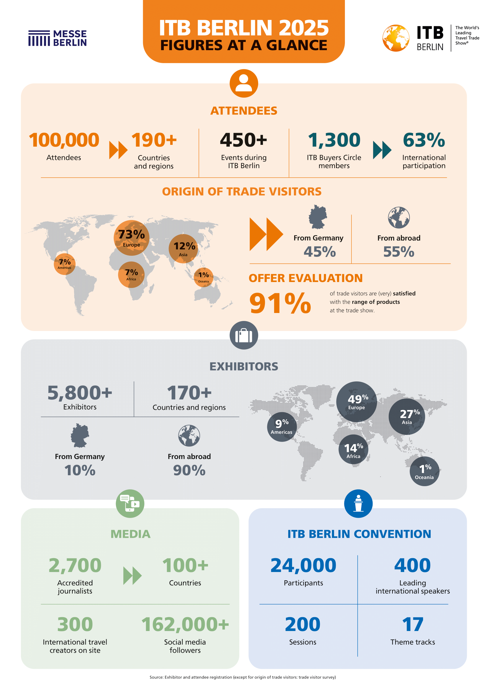 Since 1966, ITB Berlin has been the leading platform for the global travel and tourism industry. Under the motto "Discover the stories behind 60 years of legacy" ITB Berlin 2026 once again expects exhibitors and trade visitors from all over the world to a very special edition this year. ITB Berlin will celebrate its 60th anniversary in March 2026.