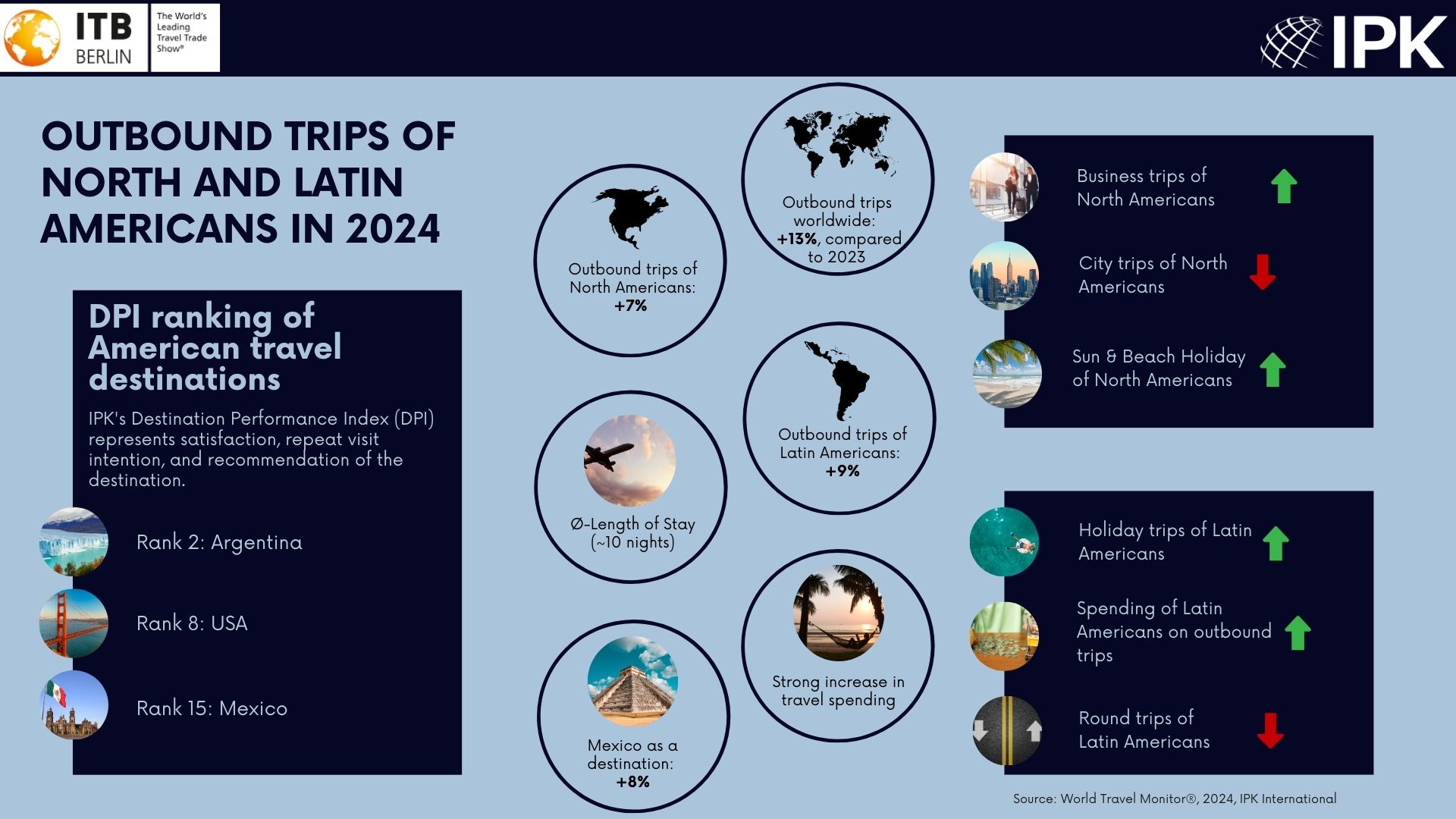 The latest data from IPK International's World Travel Monitor® shows that North and Latin America play an important role in international travel. The increasing demand for travel to these regions is reflected both in the number of trips abroad and the growing popularity of destinations in North America and especially Latin America. A survey of travel intentions in 2025 confirms this and points to dynamic growth in travel for 2025.